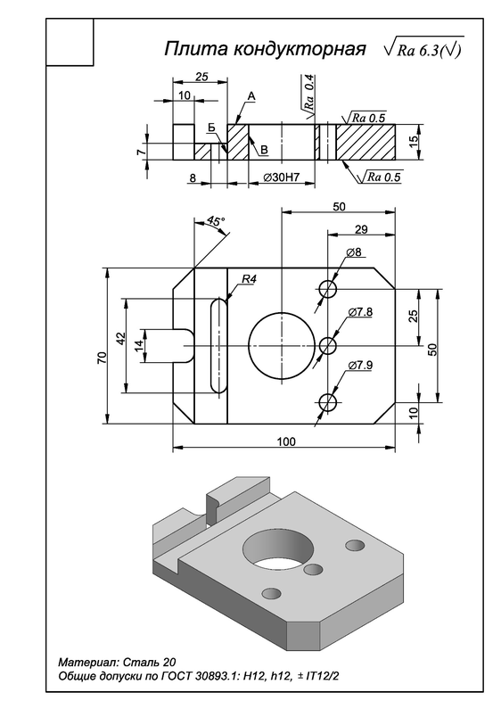 Крышка представляет собой деталь класса корпус. Габаритные размеры детали 100х70х15. Имеет 4 сквозных отверстия различных диаметров: 30 мм, 8 мм, 7,9 мм, 7,8 мм. К отверстию диаметром 30 мм предъявляется повышенные требования к точности: Н7. С 1 стороны детали параллельно боковой поверхности на расстоянии 19 мм от нее нарезан сквозной паз глубиной 8 мм. В пазе расположено отверстие прямоугольной формы (42х8) со скругленными краями. С этой же стороны детали на боковой поверхности во взаимно перпендикулярной плоскости расположен паз глубиной 14 мм, расположен он на оси симметрии. Технологической базой является наружная поверхность детали.