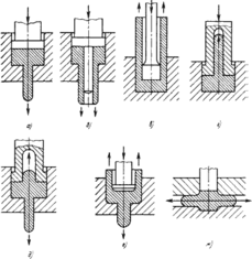 Рис. Схемы выдавливания: а,б – прямого; в, г – обратного; д, е – комбинированного; ж – бокового