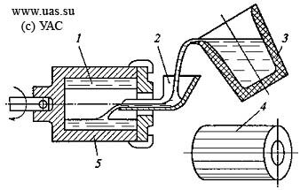 Расплавленный металл из ковша заливают во вращающуюся форму, укреплнную на шпинделе, который вращается от электродвигателя