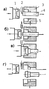 хема процесса штамповки на горизонтальноковочной машине представлена на рис. Нагретый до температуры горячей деформирования пруток 4 закладывают в неподвижную матрицу 3 (рис., а и б). Положение конца нагретого прутка определяется упором 2. Подвижная матрица 5 подходит к неподвижной матрице 3 и зажимает пруток. На пути движения пуансона 1 находится упор 2. При подходе пуансона 1 упор 2 автоматически отходит. Далее высадка прутка, при этом металл заполнит полость матрицы (рис., в). Достигнув крайнего переднего сложения, ползун двигается в обратном направлении, а пуансон из полости матриц выходит на некоторое расстояние, после чего матрицы раскрываются, а высаженную поковку вынимают или она выпадает из матрицы, после чего пуансон и матрица принимают исходное положение (рис., г).