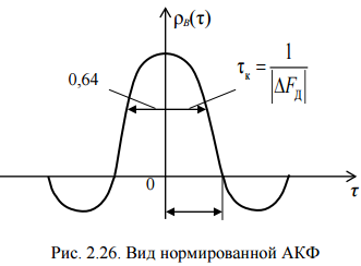 Из взаимосвязи энергетического спектра с АКФ сигнала следует важный вывод: чем шире энергетический спектр, тем ýже пик АКФ, т. е. тем меньше время корреляции зондирующего сигнала