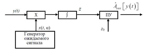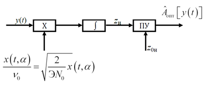 Непосредственное интегрирование произведения x(t,α)y(t) дает корреляционный интеграл, который сравнивается с порогом z0 в пороговом устройстве. Уровень порога подбирается так, чтобы вероятность F ложного превышения порога была не больше допустимой.