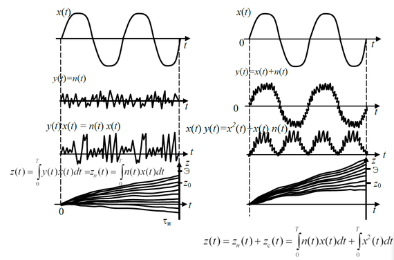 Рассмотрим физические процессы, происходящие в корреляционном обнаружителе. Для этого воспользуемся рисунками, иллюстрирующими корреляционную обработку для двух случаев: приема только помехи y(t) = n(t) и смеси сигнала с помехой y(t) = x(t,α) + n(t).