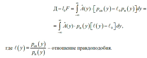 Отношение правдоподобия представляет собой отношение плотностей вероятности одной и той же реализации y при двух условиях: когда действует сигнал и помеха и когда действует только помеха. Оно характеризует, какую из гипотез о выполнении указанных взаимоисключающих условий следует считать более правдоподобной.