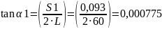 Рассчитывается тангенс угла, на который повернется заготовка. Она поворачивается вследствие зазоров. В данном случае центром вращения является точка О. При повороте заготовка повернется либо до конца по зазору S1, либо до конца по зазору S2 и S3. Рассчитаем тангенсы углов для обоих случаев, меньший из них и будет использоваться при расчете (при повороте на меньший угол один из пальцев упрется в стенку отверстия, т.е. дальнейший поворот буде невозможен)