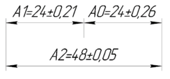 Размер 24±0,05 мм не задан на чертеже детали. Следовательно, для эксплуатации детали он не важен. А0 принимается в качестве замыкающего размера по 14 квалитету Td(A1)=0,26 мм. Допуск на А1 получается из разности допусков замыкающего размера и второго размера, оставляющего размерную цепь: Td(A1) = (±0,26) – (±0,05) = ±0,21 мм.