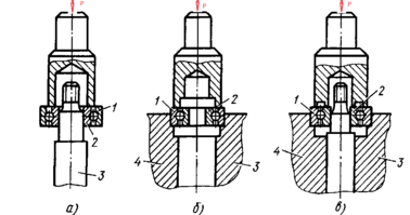 Схемы запрессовки подшипника качения: а) — на вал, б) — в корпус, в) — на вал и в корпус одновременно; 1, 2 —наружное и внутреннее кольца подшипника, 3— вал, 4—корпус.