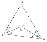риангуляционный метод - метод пеленгации помехопостановщиков из двух и более разнесенных приемных пунктов, один из которых расположен в точке А, а остальные в точках В и С. Решение задачи. Дано: расстояние между локаторами: AB, углы на плоскости: 1 и 2, углы от горизонтальной поверхности до направлений на цель: и 2. Найти: расстояние от локатора А до цели O (длину отрезка AO). Решение: Для решения достаточно знать расстояние между локаторами и три угла: , 1 и 2. По теореме о сумме углов в треугольнике ABC следует: