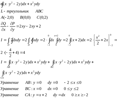 по замкнутому контуру L:х=0,у=0, х-у=2 пробегаемому против часовой стрелки двумя способами: непосредственно и по формуле Грина.