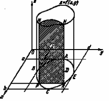 Предположим сначала, что область интегрирования D удовлетворяет следующему условию: любая прямая, параллельная оси Ox или Oy, пересекает границу области не более чем в двух точках. Соответствующее цилиндрическое тело изображено на рис.3