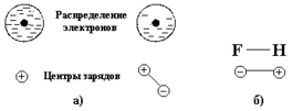 Металлическая связь не имеет направленности. Следствием этого является сферическая симметрия силовых полей валентных электронов и вытекающая отсюда симметрия и большая компактность структур. Наиболее распространены среди металлов плотно упакованные решетки с координационным числом 12. Эта связь занимает промежуточное положение между ковалентной и ионной. Она может быть сравнима с ковалентной, так как электроны обобществляются соседними атомами, и с ионной, поскольку отрицательные электроны скрепляют вместе положительные ионы. Энергия этой связи может составлять величину порядка 105 Дж/моль.Силы Ван дер Ваальса. Эти силы являются наиболее общим типом связи между любыми атомами и молекулами. Они обусловлены наличием внутренних диполей, образующихся в результате дисперсионных эффектов (т. е. в результате статистической неоднородности распределения электронов в атомах и молекулах, рис.2.3, а), либо представляющих собой постоянные диполи в асимметричных молекулах (рис. 2.3,6). В первом случае среднее значение электрического момента атома равно нулю. Однако в каждый момент времени электроны локализуются в конкретной области пространства, создавая мгновенные электрические диполи. При сближении атомов в движении электронов устанавливается корреляция, энергия системы понижается, возникают силы притяжения, связывающие атомы. Во втором случае между полярными молекулами возникает электростатическое взаимодействие, стремящееся расположить их в строгом порядке. При этом энергия системы уменьшается и возникает устойчивое состояние. Подобное взаимодействие называется ориентационным. Например, на рис. 2.3, б показан постоянный диполь HF, возникающий вследствие несовпадения центров положительного и отрицательного зарядов.