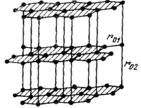 Некоторые твердые тела могут иметь не одну, а две и даже более кристаллических структур, устойчивых при разных температурах и давлениях. Например, кристаллы золота при высокой и низкой температурах имеют разную структуру; резко отличаются структуры кристаллов углерода при обычных условиях (графит) и при высоких давлениях и температурах (алмаз). В решетке алмаза каждый атом окружен четырьмя ближайшими соседями, расположенными в вершинах тетраэдра, с которыми он связан прочными ковалентными связями (рис.2.9). Длина связи 0,154 нм, энергия связи до 106 Дж/моль. На рисунке выделена элементарная ячейка алмаза. В решетке же графита (рис.2.10) атомы углерода образуют двумерные слои. Расположение атомов в слоях таково, что каждый оказывается окруженным тремя ближайшими соседями, связанными с ним ковалентной связью. Длина связи r01= 0,142 нм, расстояние же между слоями r02= 0,34 нм. На таком большом расстоянии действуют лишь силы Ван дер Ваальса. Поэтому энергия связи между слоями — порядка 103 Дж/моль.