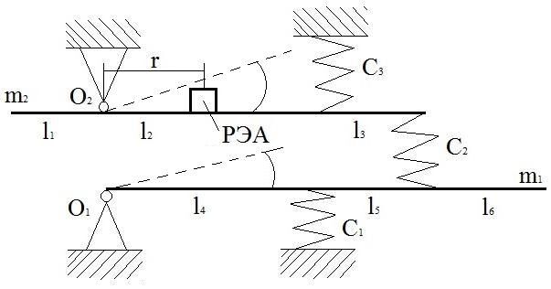 Система на рис.1 имеет две степени свободы. Выберем обобщенные координаты – углы поворота платы и вокруг шарнирных креплений и . Для выполнения амортизации необходимо, чтобы < [ ].