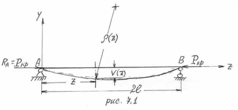 При действии в сечении «В» критической силы «Р кр» стержень получит боковое выпучивание. Перемещением подвижного шарнира «В» пренебрегаем , считая , что длина стержня 2l остается неизменной. Стержень работает на изгиб. Сечению «Z» соответствует прогиб «V» и кривизна «ρ». Выше было получено выражение для кривизны балки: