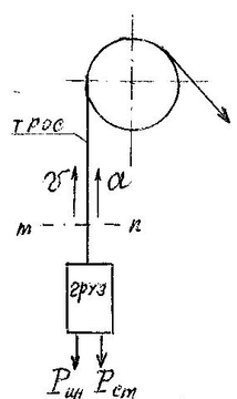 В качестве простейшего примера применения принципа Даламбера рассмотрим расчёт троса подъёмного механизма при начале его движения. Схема механизма дана на рис.17.1