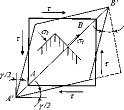 В формулы (6.1) – (6.6) входят упругие характеристики материала Е, , G и К, определяющие его упругие свойства. Однако эти характеристики не являются независимыми. Для изотропного материала независимыми упругими характеристиками являются две, в качестве которых обычно выбираются модуль упругости Е и коэффициент Пуассона . Чтобы выразить модуль сдвига G через Е и , рассмотрим плоскую деформацию сдвига под действием касательных напряжений (рис. 6.2). Для упрощения выкладок используем квадратный элемент со стороной а. Вычислим главные напряжения , . Эти напряжения действуют на площадках, расположенных под углом к исходным площадкам. Из рис. 6.2 найдем связь между линейной деформацией в направлении действия напряжения и угловой деформацией . Большая диагональ ромба, характеризующая деформацию , равна