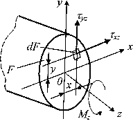 Кручением называется такой вид напряжённого состояния, при котором в поперечном сечении стержня возникает лишь один силовой фактор — крутящий момент Мz. Крутящий момент по определению равен сумме моментов внутренних сил относительно продольной оси стержня Oz. Нормальные силы, параллельные оси Oz, вклада в крутящий момент не вносят. С силами, лежащими в плоскости поперечного сечения стержня (интенсивности этих сил — касательные напряжения и ) Мz связывает вытекающее из его определения уравнение равновесия статики (рис. 10.1)