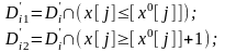 Ветвление осуществляется, если в оптимальном решении значение хотя бы одной целочисленной по исходной постановке задача переменной не является целочисленным. Среди этих переменных выбирается одна, например j – я. Обозначим ее значение в найденном оптимальном решении x0[j]. Говорят, что ветвление осуществляется по переменной x[j]. Область Di' разделяется на две подобласти Di1' и Di2' следующим образом: