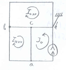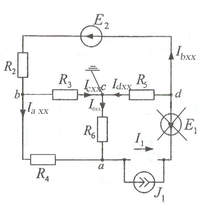 Примем R1 = ∞, т.е. рассмотрим схему 2 в режиме хх. Получим схему рис. 7.1., соответствующую эквивалентному генератору. Это новая схема 4, в которой выбираем направления ногвьх токов Iaxx , Ibxx , Icxx , Idxx , I6xx. У нее четыре узла a, b, d, c. Значит, МУП соответствует система 3 уравнений. МКТ соответствует система 2 уравнений (см. рис. 7.2), т.к. в схеме 2 контура с неизвестными контурными токами I11хх и I22хх . Ветвь с J1 создает известный контурный ток J11=J1.