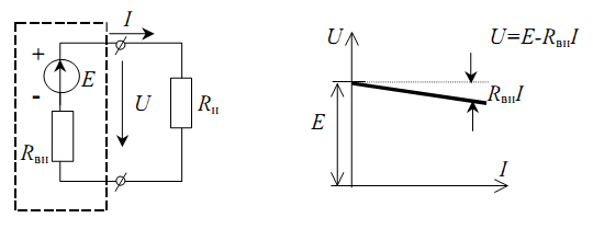 Реальный источник ЭДС представляет собой идеальный источник ЭДС с последовательно включенным сопротивлением Rвн, равным внутреннему сопротивлению реального источника ЭДС (рис.1.3).