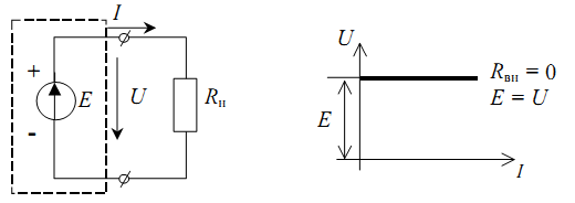 Идеальный источник ЭДС – это такой источник электрической энергии, электрическое напряжение на выводах которого не зависит от электрического тока в нем (ГОСТ Р52002-2003) (рис. 1.1).