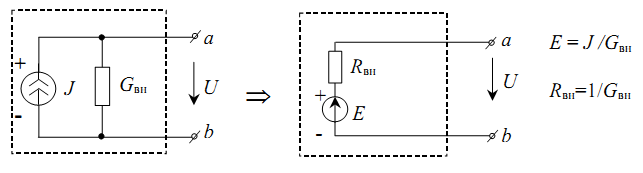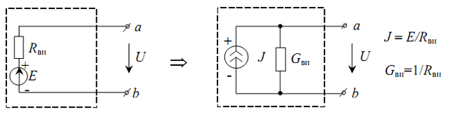Преобразование реального источника тока в реальный источник ЭДС показано на рис. 1.6.