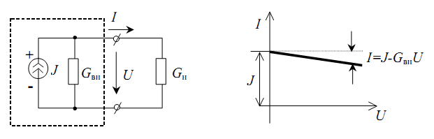 Реальный источник тока может быть представлен идеальнымисточником тока с параллельно включенной внутренней проводимостью реального источника тока (рис. 1.4).