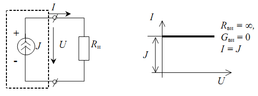 Идеальный источник тока – это такой источник, электрическая энергия, электрический ток которого не зависит от напряжения на его выводах (ГОСТ Р52002-2003) (рис. 1.2).
