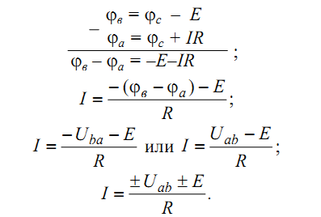 Правило знаков: если направление E совпадает с направлением тока, то выбирается знак «+», если не совпадает, то знак «-». Аналогичные рассуждения справедливы и для напряжения U.