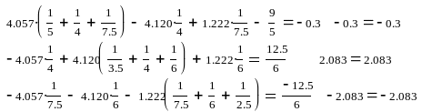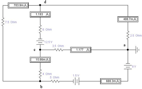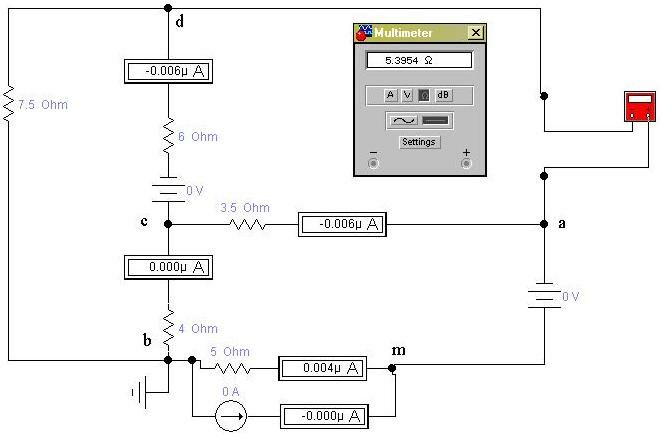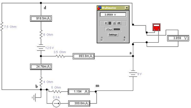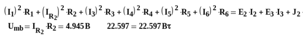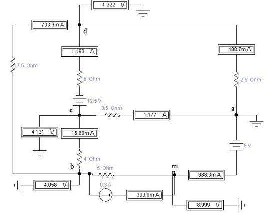 Методом компьютерного моделирования были найдены значения неизвестных потенциалов:φb=4.057 B, φd=-1.222 B, φc=4.120 B, φm=9 B. Подставив их в систему уравнений, проверяем правильность её составления: