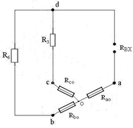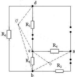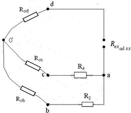Определим входное сопротивление схемы Rвхbcxx . Удаляем источники энергии, оставляя вместо источников их внутренние сопротивления RE = 0 и RJ= =∞. В схеме рис. 8 нельзя выделить параллельные и последовательные участки, поэтому делаем преобразование треугольника abc и треугольника abd в звезду.