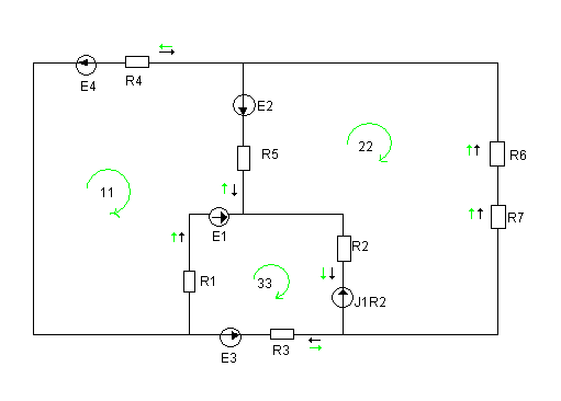 -I11R5+I22(R2+R5+R6+R7)-I33R2=E5-E2
