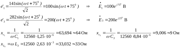 Найдем действующие значения источников ЭДС, емкостных и индуктивного сопротивлений.