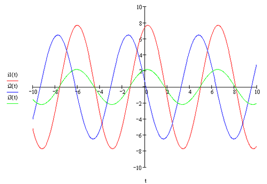 6. Используя данные расчетов, полученных в п. 2, записать выражения для мгновенных значений токов i1(t), i2(t), i3(t) и построить их графики.