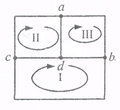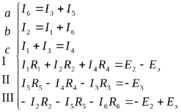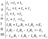 Уравнения по II закону Кирхгофа составляются для ячеек графа. Направление обхода контуров можно выбирать произвольно. Решая систему, находим неизвестные токи I1 ,I2 IR2 ,I3 ,I4 ,I5 ,I6 (по заданию решать систему не нужно).
