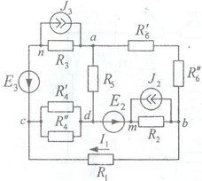 Составить систему уравнений по законам Кирхгофа. Возле уравнений поставить обозначение узлов и соответственно контуров. Перечислить токи, определяемые в результате решения системы (решение системы не выполнять). Методом компьютерного моделирования определить эти токи и, подставив их в систему уравнений, проверить правильность ее составления.