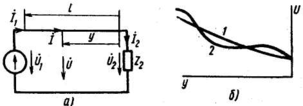 График зависимости действующего значения напряжения U от расстояния у для линии с потерями при согласованной нагрузке иллюстрирует кривая 1 на рис б, при несогласованной — например кривая 2 на рис. б.