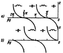 Стоячая электромагнитная волна образована стоячими волнами напряжения и тока. Математически такие волны описываются произведением двух периодических (в нашем случае — тригонометрических ) функций. Одна из них — функция координаты текущей точки на линии (в нашем случае βy), другая — функция времени ( ωt ). Стоячие волны напряжения и тока всегда сдвинуты по отношению друг к другу в пространстве и во времени. Сдвиг во времени между стоячими волнами напряжения и тока равен 90°, сдвиг в пространстве — четверти длины волны.