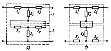 | A = 1 + ( Z1 / Z3 ) B = Z1 + Z2 + Z1Z2 / Z3 C = 1 / Z3 D = 1 + Z2 / Z3 | Z3 = 1 / C Z1 = ( A – 1 ) / C Z2 = ( D – 1 ) / C | и | A = 1 + ( Z4 / Z5 ) B = Z4 C = ( Z4 + Z5 + Z6 ) / Z5Z6 D = Z4 / Z5 + 1 | Z4 = B Z5 = B / ( D – 1 ) Z6 = D / ( A – 1 ) |