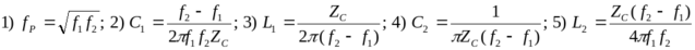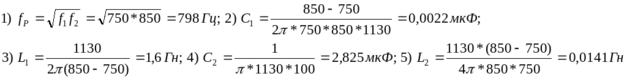 Пример. Определить параметры полосового фильтра рис. 1 а, исходя из того, что он должен пропускать полосу частот от f1 = 750 Гц до f2 = 850 Гц и что при резонансной частоте fp сопротивление нагрузки Zn = Zc = 1130 Ом. Решение: