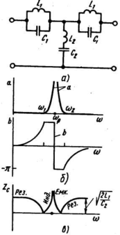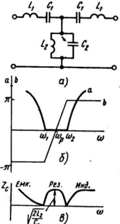 представлен на рис.5 г. В этом случае характер изменения ZСТ отличен от характера изменения ZСT для Т-фильтра НЧ, а именно ZСT = 0 при ω = ω1 = 1 / √2LC. С увеличением ω сопротивление ZCT увеличивается и при ω ∞ ZCT = √2L/C.