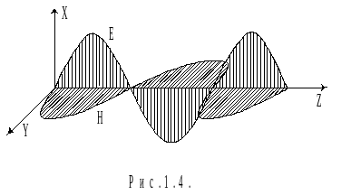 Рассмотрим первые два уравнения системы (1.4). Из уравнений видно, что любой ток создает магнитное поле в окружающих точках пространства. Постоянный ток создает постоянное магнитное поле. Вокруг переменного тока создается переменное магнитное поле, способное создавать в "следующем" элементе пространства электрическое поле, которое, в свою очередь, создает новое магнитное поле и т.д. Таким образом, электромагнитное поле распространяется в пространстве со скоростью света в виде незатухающей поперечной волны (рис.1.4).