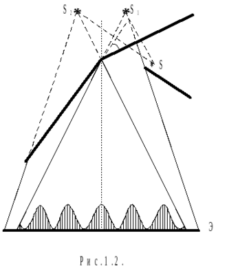 Ж.Френель поставил следующий опыт. Узкая щель (см. рис. 1.2.) освещалась солнечным светом. Световой поток, прошедший через нее, отражался от двух плоских зеркал, поставленных почти параллельно друг другу. Отраженный от них свет падал на экран Э, поверхность которого оказалась неравномерно освещенной. На ней был виден ряд темных и светлых полос. Освещение экрана становилось равномерным, если одно из зеркал было закрыто.Это явление необъяснимо с точки зрения корпускулярной теории света. Если каждое из зеркал в отдельности отбрасывает к экрану известное число световых частиц, то совместное действие обоих зеркал может привести лишь к увеличению числа падающих на экран частиц, т.е. к увеличению яркости освещения экрана. Наблюдаемое на экране изменение яркости (интерференция света) могло быть объяснено тем, что мы имеем дело с волновыми процессами, поскольку только наложение двух волн может привести к усилению или ослаблению яркости освещения экрана.