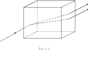 С волновой точки зрения можно было объяснить и явление огибания светом различных препятствий. Гримальди назвал это явление дифракцией. Его может наблюдать любой человек, посмотрев на яркую светящуюся лампу, находящуюся на расстоянии 20-40м от него, через два пальца, плотно прижатых друг к другу так, чтобы между ними оставалась узкая щель. Вместо одной светящейся щели можно увидеть поперечную щели полосу, состоящую из яркой центральной и чередующихся боковых темных и светлых полос.Успехом волновой теории явилось и объяснение свойства света, названного Ньютоном поляризацией. Это свойство проявляется, например, в том, что, проходя через некоторые кристаллы, световой луч, преломляясь, разделяется на два луча, распространяющихся в кристалле по различным направлениям и, следовательно, выходящих из него в различных точках пространства (рис.1.3).