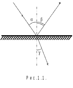 2. Закон независимости световых пучков: распространение всякого светового пучка в среде совершенно не зависит от того, есть ли в ней другие пучки света или нет. Это означает, что при пересечении пучков действие одного пучка не возмущает действия другого.3. Закон отражения. Условимся понимать под лучом конечный, но достаточно узкий световой пучок. Теперь сформулируем закон отражения. Луч падающий и луч отраженный лежат в одной плоскости с нормалью, восстановленной к границе раздела в точке падения (эта плоскость называется плоскостью падения), причем угол падения равен углу отражения (рис.1.1).