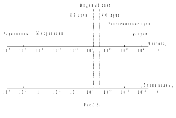 Что касается отличий, существующих между электромагнитными волнами, обнаруженными Герцем, и световыми, то они могут быть объяснены только отличием длин волн. Можно было утверждать, что явления оптические представляют собой частный случай более общего класса электромагнитных явлений.Видимый свет, непосредственно воспринимаемый человеческим глазом, занимает узкий интервал длин электромагнитных волн от 0,40 до 0,76 мкм. В этом диапазоне лежит максимум интенсивности электромагнитных волн, излучаемых Солнцем. По-видимому, в этом состоит биологическая причина чувствительности глаза именно в этой области спектра. Со стороны длинных волн к видимому излучению примыкает инфракрасное (ИК) излучение. Оно испускается нагретыми телами. Длины волн ИК излучения в вакууме лежат в пределах от 1 мм до 0,76 мкм. За ним следует диапазон радиоволн, длина которых в вакууме больше 50 мкм. С коротковолновой стороны к видимому свету примыкают ультрафиолетовые (УФ) лучи (длина волны от 400 до 10 нм). Затем идет рентгеновское и -излучение с условными границами от 10 нм до 0,10 пм. Рентгеновское излучение возникает при взаимодействии заряженных частиц и фотонов с атомами вещества: -излучение (< 0,1 нм) испускается возбужденными атомными ядрами при радиоактивных превращениях и ядерных реакциях. Шкала электромагнитных волн представлена на рис.1.5.