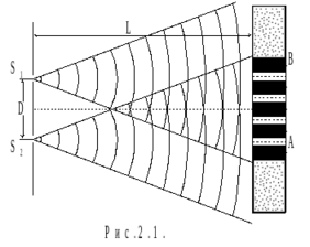 Пусть имеется два когерентных источника S1 и S2 в виде двух узких длинных параллельных щелей, лежащих в одной плоскости и расположенных в воздухе (n=1) на расстоянии D друг от друга. Экран, на котором наблюдается интерференционная картина, расположен в плоскости, параллельной плоскости источников, на расстоянии L от нее (рис.2.1). S1 и S2 являются источниками волн с цилиндрическим фронтом частотой . На экране в области перекрытия световых пучков АВ (называемой полем интерференции) наблюдается интерференционная картина в виде полос, параллельных щелям.