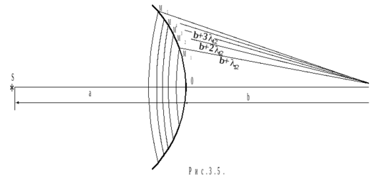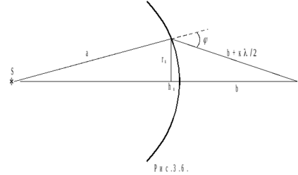 Применим принцип Гюйгенса-Френеля для нахождения амплитуды светового колебания, возбуждаемого в точке В сферической волной, распространяющейся в однородной среде из точечного источника S. Для этого разобьем волновую поверхность на кольцевые зоны, называемые зонами Френеля, построенные таким образом, что расстояние от краев соседних зон до точки наблюдения В отличается на половину длины волны /2 (рис.3.5).
