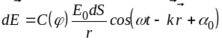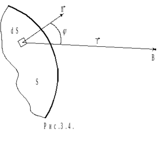 Согласно принципу Гюйгенса-Френеля каждый элемент dS волновой поверхности служит источником вторичной сферической волны, амплитуда которой удовлетворяет следующим условиям: она пропорциональна площади dS и убывает с расстоянием от источника по закону 1/r. От каждого участка dS волновой поверхности в точку наблюдения B (рис.3.4) приходит световое колебание где (t+0) и E0- фаза и амплитуда колебаний в месте, где расположен элемент dS, r - расстояние от элемента dS до точки B, k=2/ - волновое число. Коэффициент пропорциональности С() убывает при увеличении угла между нормалью к dS (вектором