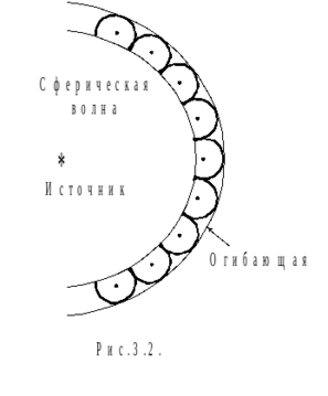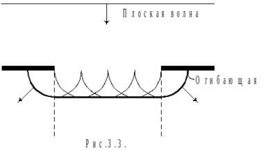 Явление дифракции может быть объяснено с помощью принципа Гюйгенса, согласно которому каждая точка, до которой доходит волновое возмущение в момент времени t, является центром вторичных волн. Огибающая этих волн дает положение фронта волны в момент времени t+dt (рис.3.2).Пусть на плоскую преграду с отверстием (рис.3.3) падает волна с параллельным преграде фронтом. По Гюйгенсу каждая точка выделяемого отверстием участка волнового фронта служит центром испускания вторичных волн, которые в однородной и изотропной среде будут сферическими. Построив огибающую вторичных волн, мы убеждаемся в том, что за отверстием волна проникает в область геометрической тени, огибая края преграды.